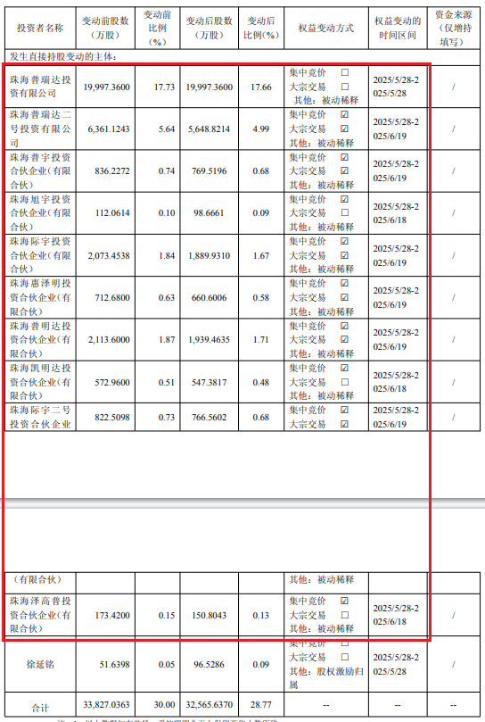 公告称,公司于近日收到控股股东珠海普瑞达投资有限公司(以下简称:珠海普瑞达)及其一致行动人出具的《权益变动告知函》。2025年5月28日,公司2023年限制性股票激励计划首次授予部分第二个归属期的股份登记手续完成并上市流通,本次限制性股票归属后,公司股本总数由1,127,568,192股增加至1,132,068,851股,徐延铭持股数量由516,398股增加至965,286股,控股股东珠海普瑞达及其一致行动人员工持股主体、徐延铭合计的持股比例被动稀释。2025年6月9日至2025年6月19日期间,员工持股主体通过集中竞价交易及大宗交易方式减持公司股份,控股股东珠海普瑞达与实际控制人徐延铭未减持公司股份。前述因素综合导致控股股东珠海普瑞达及其一致行动人员工持股主体、徐延铭合计持股比例由30.00%变动至28.77%,权益变动触及1%刻度。