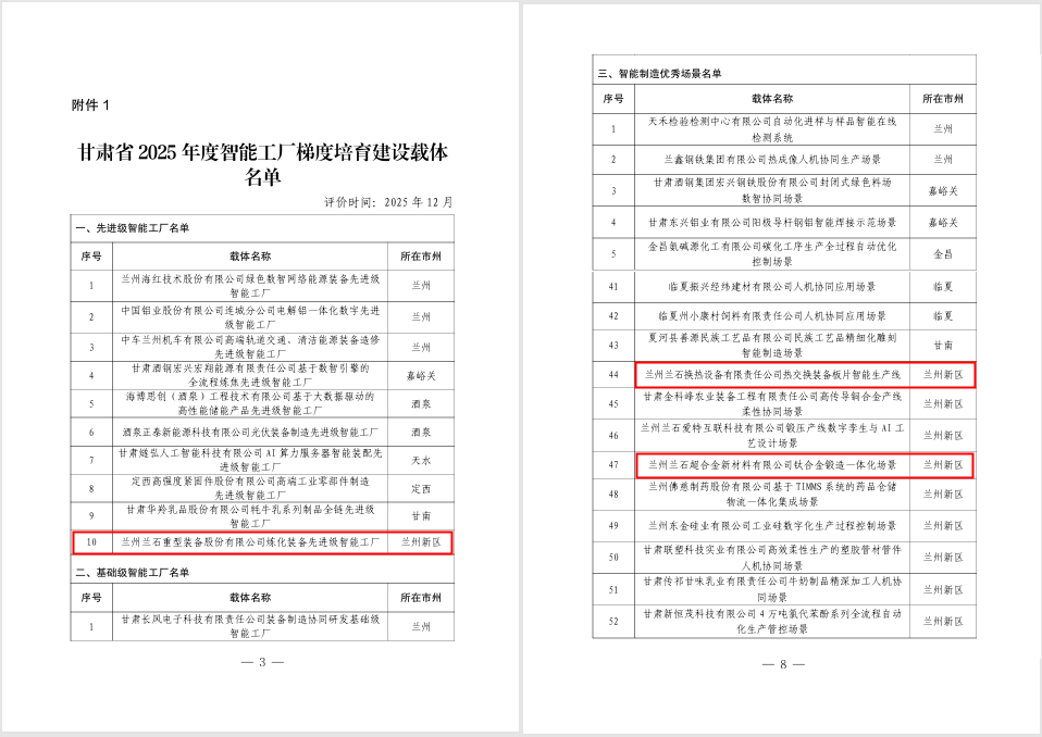 近日,甘肃省2025年度智能工厂梯度培育建设载体名单及2020-2024年度人选省级智能制造体系重新评价结果公布,兰石重装(603169)获评先进级智能工厂,换热公司热交换装备板片智能生产线、超合金公司钛合金锻造一体化场景分别获评智能制造优秀场景,重工公司、换热公司通过先进级智能工厂复审。