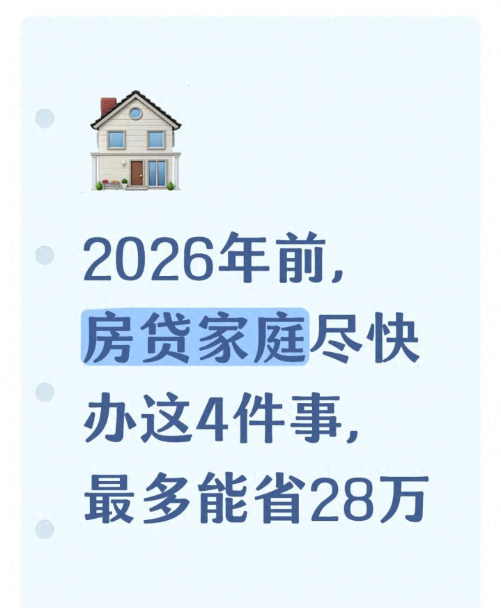 2026年房贷市场的政策红利密集落地,公积金贷款利率下调、商贷重定价机制优化、房贷贴息政策扩围……一系列利好让房贷家庭迎来了省钱的黄金窗口期。银行内部人士透露,只要在2026年前办好这4件事,不仅能搭上利率下调的顺风车,还能避开还款中的隐形坑,不少家庭已通过这些操作省了几万甚至几十万利息,最高能省28万。今天就用大白话把这4件事的操作方法、省钱逻辑讲透,全是能直接落地的干货,帮房贷家庭把利息省到实处。